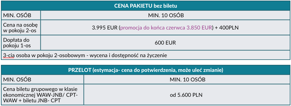 Oferta przelotu ma charakter poglądowy, nie jest potwierdzeniem rezerwacji; cena może ulec zmianie w zależności od dostępności miejsc na rejsach; rezerwacja grupowa możliwa po zebraniu min. 10 osób, bilet niezwrotny, wylot grupy musi być razem. Bilety wystawiane na 7 dni przed wylotem. Specjalne życzenia ws cateringu na pokładzie (np. vege) – trzeba złożyć przed wystawieniem biletu.